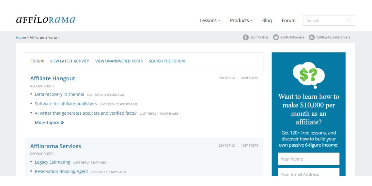 Affilorama Forum is a beginner-friendly platform that focuses on helping new affiliate marketers learn the basics and grow their skills. It provides access to training resources, guides, and discussions on various marketing topics such as SEO, email marketing, and social media.
